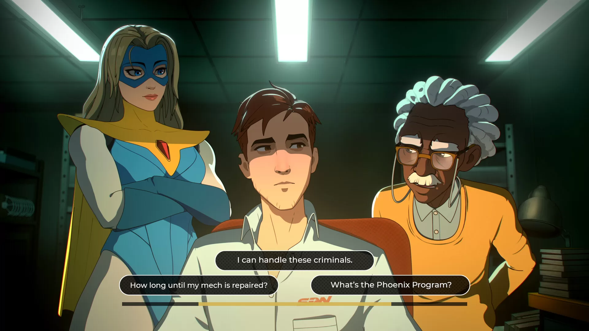 However, at times, the superheroes can act on their own accord, and this is what is engaging. There’s an in depth story here, with a framing of a new employee navigating a brand new workplace. You have choices and there’s a un-nerving “XYZ will remember this” that flashes up whenever you have something that can affect you. I’m at the end of Episode 4 (episodes are framed based on a single day, and take about an hour to complete), and had a choice at the end of it that brought flashbacks to the choices in Life is Strange – where it feels so consequential. I went “Oh no!” at the end, as you do build bonds with these characters, and right now there’s a sense of foreboding….
