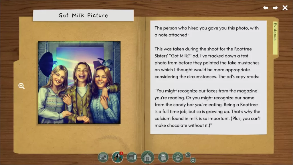 The Roottrees are Dead is a fun, 10 hour or so mystery where you examine who inherits the vast Roottrees fortune. Only blood relatives can lay claim to it, so your job is to build the family tree to discover who are actual biological Roottrees. Find their name, their job and what they look like. Dig through library archives and 1998 internet to find out information about individuals. The satisfying elements are when printers whir into action, meaning you’ve uncovered a clue.